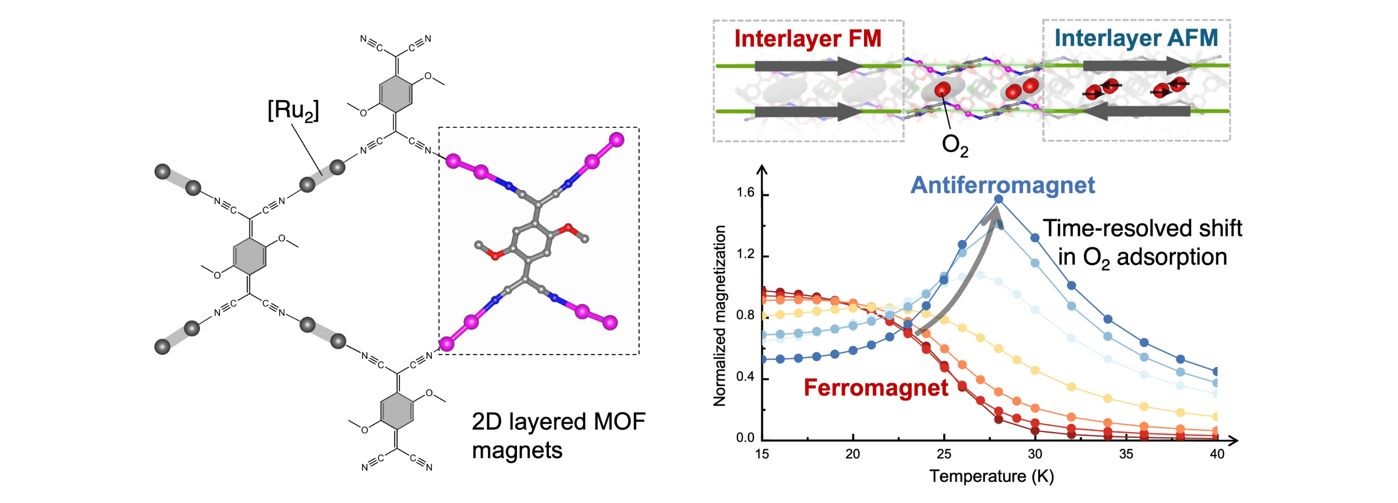 金属―有機構造体(MOF)は、多孔性と長距離磁気秩序を併せ持つことが可能であり、物質輸送を介した磁気相の精密な変調を実現してきた。多くのゲスト応答性MOF磁石では、ゲスト分子の導入が格子に電子的または構造的摂動を与え、二元的なON/OFF型の相転移を誘起する。しかし、ゲストの挿入量に応じたドメイン形成や協同現象を伴う連続的な磁気相転移の制御については、これまで十分に議論されてこなかった。一方、酸素(O2)のようなスピン活性ゲストは、磁気交換経路を直接媒介することにより、磁気秩序の連続的かつ可制御な進化を実現し得る。しかし、ゲスト吸着とスピン媒介の動的磁気変遷は依然として未解明であった。本研究では、反強磁性層間に存在するボトルネック状の孤立細孔にO2二量体が閉じ込められることで、結晶構造の大きな変化を伴うことなく、強磁性から反強磁性への連続的な磁気相転移が誘起されることを実証した。さらに、O2の挿入量が反強磁性ドメインの協同的成長に対応することを明らかにした。密度汎関数理論(DFT)計算の結果、反強磁性的に結合したO2二量体が隣接するフェリ磁性層間の磁気交換を媒介し、反強磁性秩序を安定化させていることが示された。